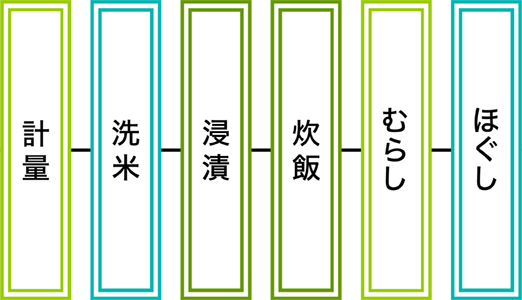 - 浸漬時間はおよそ夏場で30分、冬場で60分が理想です。この行程が不十分になると、炊きあがったご飯に芯が残り硬くなってしまいます。